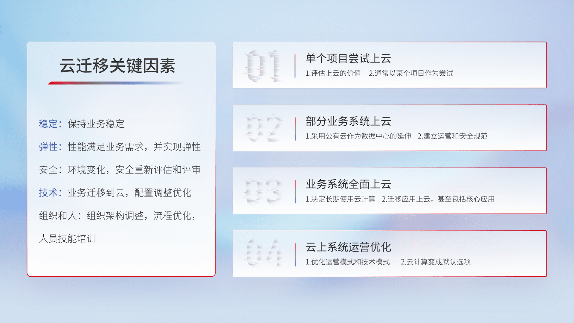 结合实际业务,,,,从规划设计、、、云平台选型、、、云原生改造、、、、数据迁移、、、集成交付,,迁移全过程为客户识别最佳上云路径,,做好风险识别管理,,,,设计网络架构、、、身份权限、、、、安全审计合规、、、操作审计、、日志审计、、、监控告警策略、、、多站点容灾设计等,,,对云上基础设施进行整体规划,,,提升IT治理水平,,以满足弹性、、高可用、、高性能的需求。。
