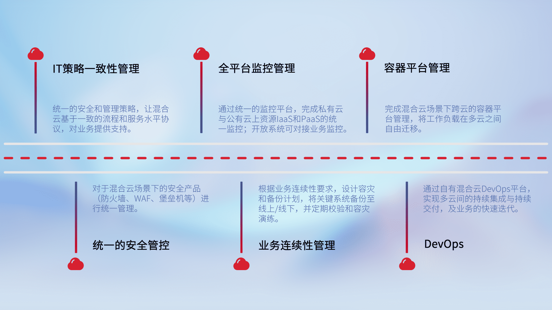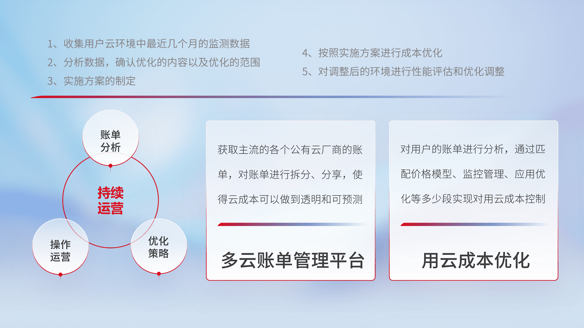 通过多云纳管,,,以统一的资源数据模型把客户的云资源进行抽象和封装,,进而实现对多云资源的统一操作,,,保障云资源管理的可靠性、、、稳定性与可用性。。量身定制化运维内容,,,,配置、、、、开发运维、、、、补丁管理、、、、备份、、、、监控、、、、认证和访问管理、、、、审计和日常巡检等,,,保障在用云过程中的可靠度,,,,稳定度以及高可用率。。