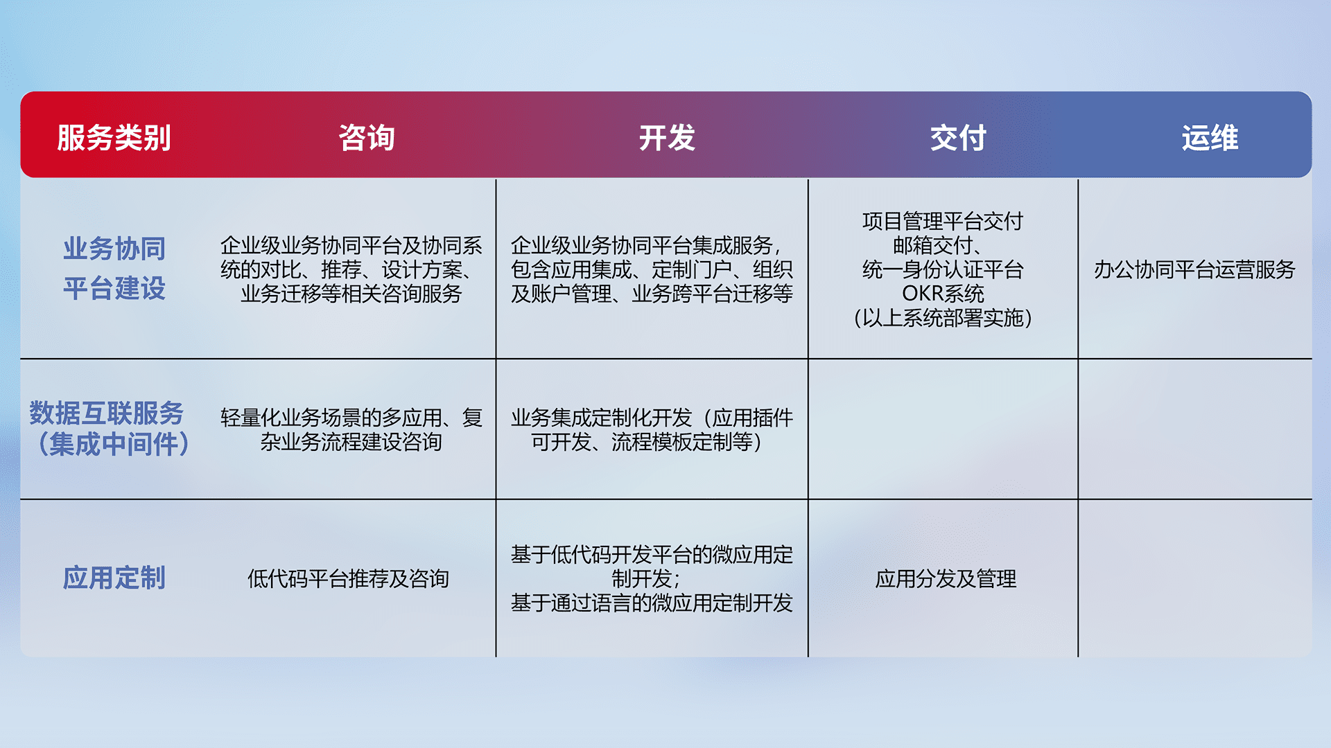 针对钉钉、、、、企微、、、、IDaas等平台级产品提供产品的规划、、、、方案、、、交付、、、定制化开发等服务,,实现如统一协同办公、、、智能客户服务、、、、混合会议管理、、、智能数据查询、、、等业务场景,,,,实现数字化转型。。。